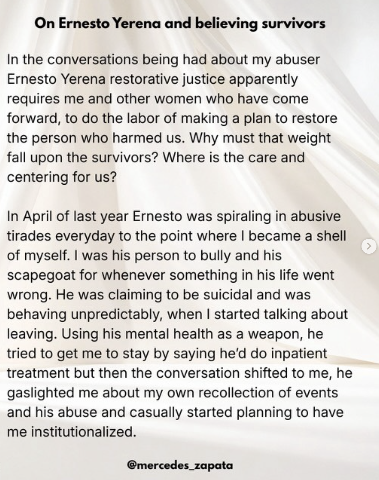 Her words push directly against how the conversation has shifted, especially around the idea of repair. She writes, “restorative justice apparently requires me and other women who have come forward to do the labor of making a plan to restore the person who harmed us,” then asks, “why must that weight fall upon the survivors and where is the care and centering for us?”