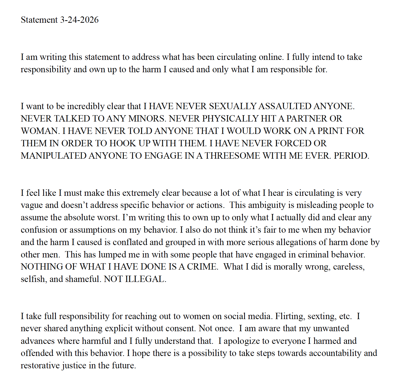 In the statement, he denies accusations of criminal abuse, writing, “I have never sexually assaulted anyone. Never talked to any minors. Never physically hit a partner or woman.”